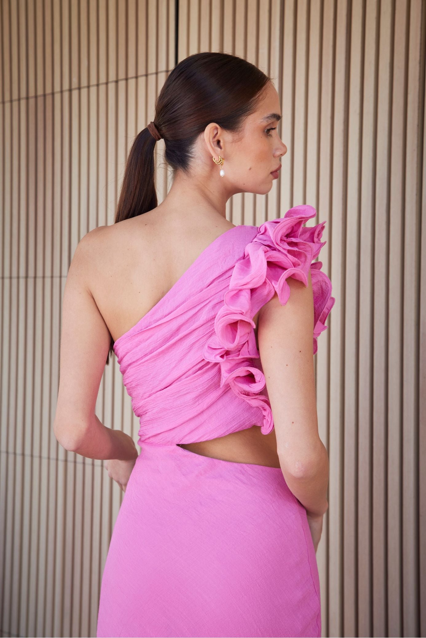 The Hera Maxi Dress exudes elegance and grace. This captivating design features a one-shoulder silhouette that drapes effortlessly, with a subtle waist cutout revealing a touch of skin. A delicate ruffle detail cascades from the single shoulder, adding whimsical charm while maintaining sophistication. The Hera Maxi Dress is a timeless statement, crafted to empower and radiate elegance, promising to be a memorable part of your special moments.