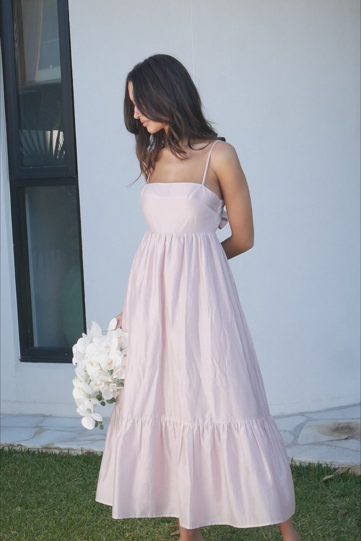 The Mafalda Dress is a delicate and versatile piece that features a simple yet elegant design. With its soft pink hue and midi length, this dress is perfect for those who appreciate understated elegance. It has thin spaghetti straps and a fitted bodice that flows into a relaxed, tiered skirt, creating a flattering and comfortable silhouette.