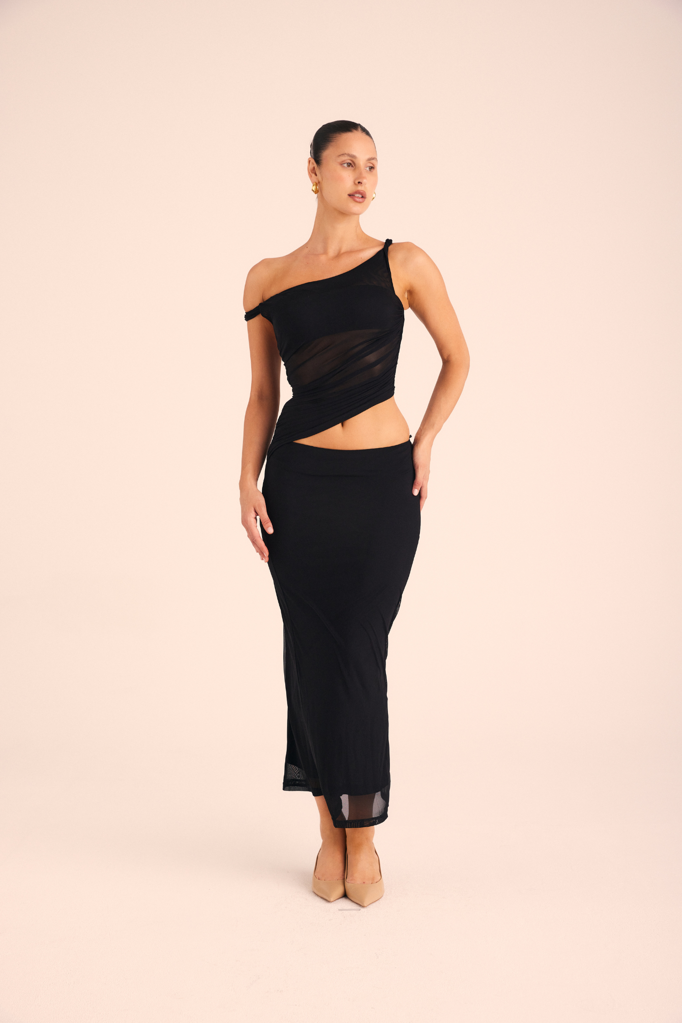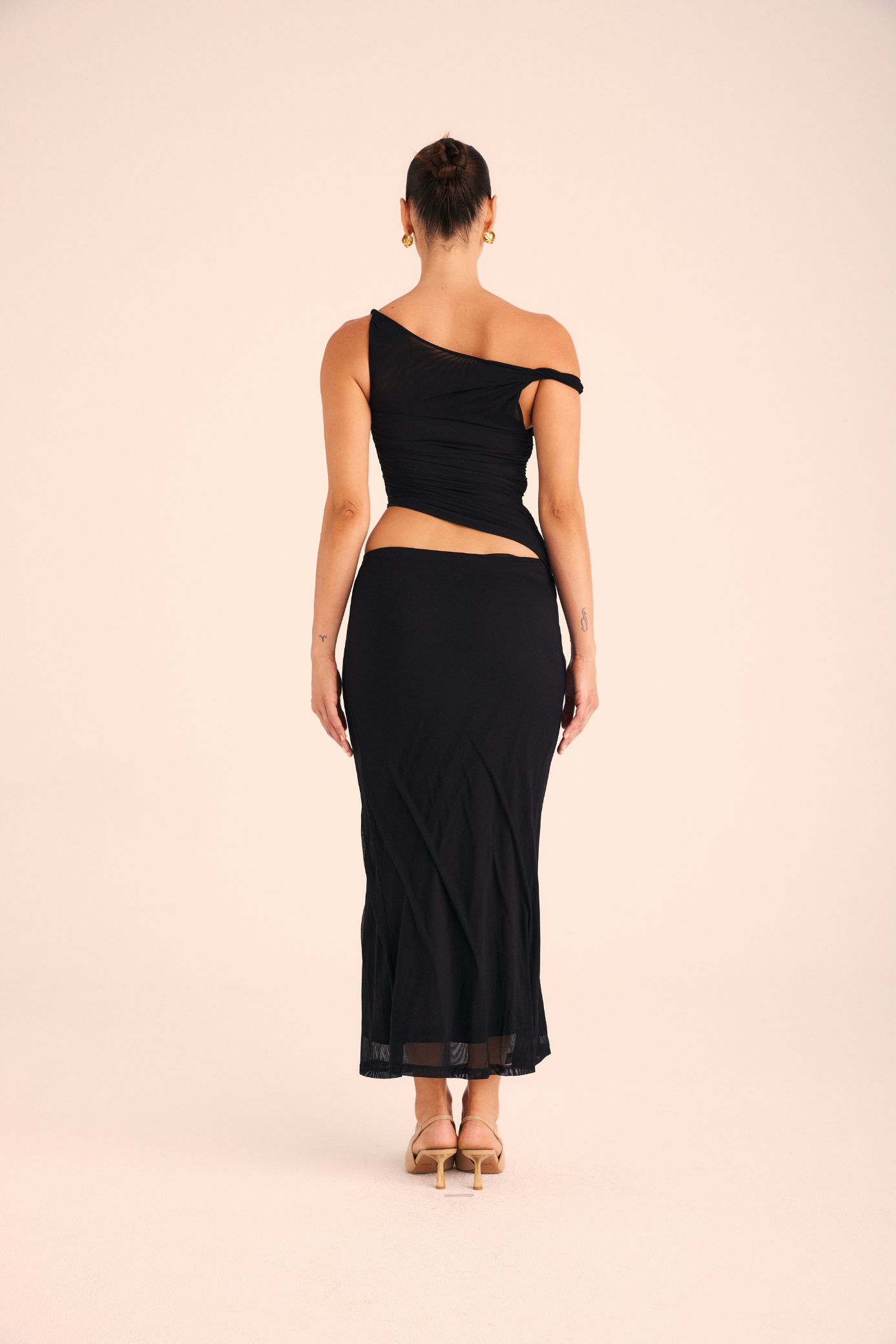 The Matilda Maxi Dress combines modern sophistication with a sultry edge, featuring an asymmetrical neckline and subtle cut-out detail. The perfect balance of bold and chic.